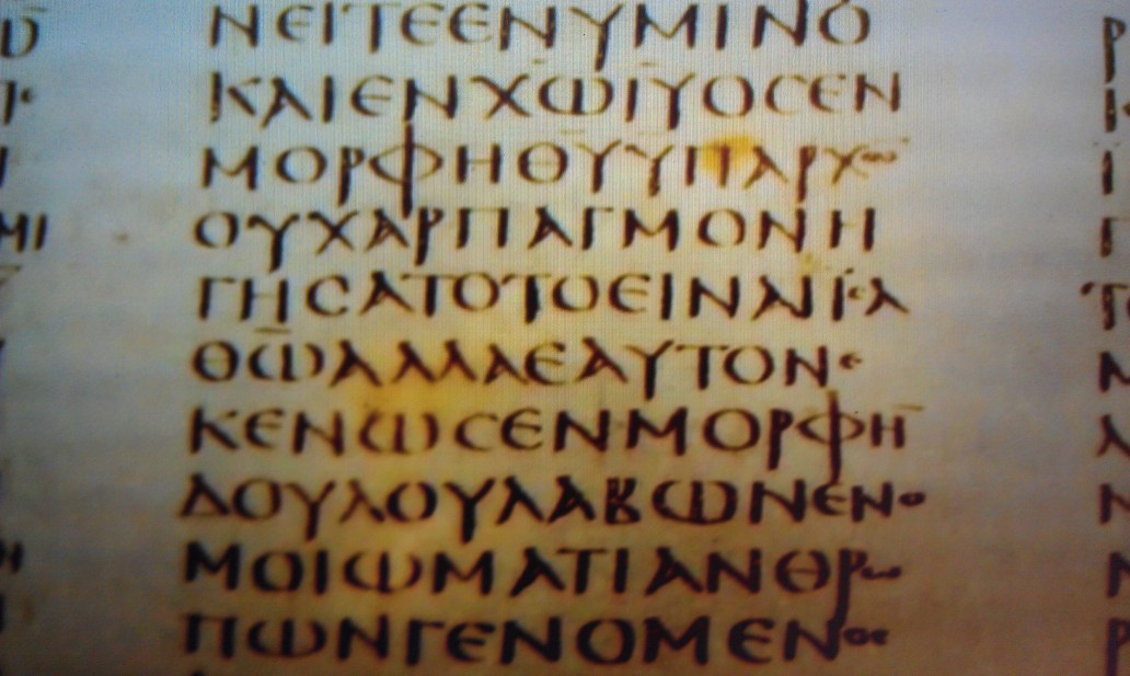 Anyway, the term μορφή as it appears in today’s Greek New Testament would have originally been written in this uncial form. It would have looked like this: ΜΟΡΦΗ. The uncials were written in scriptio continua or continuous script (no spaces between words). They also had no breathing marks or polytonic accents. Here is a photo of Philippians 2:6-7 which contains 2 uses of ΜΟΡΦΗ. Can you spot them?